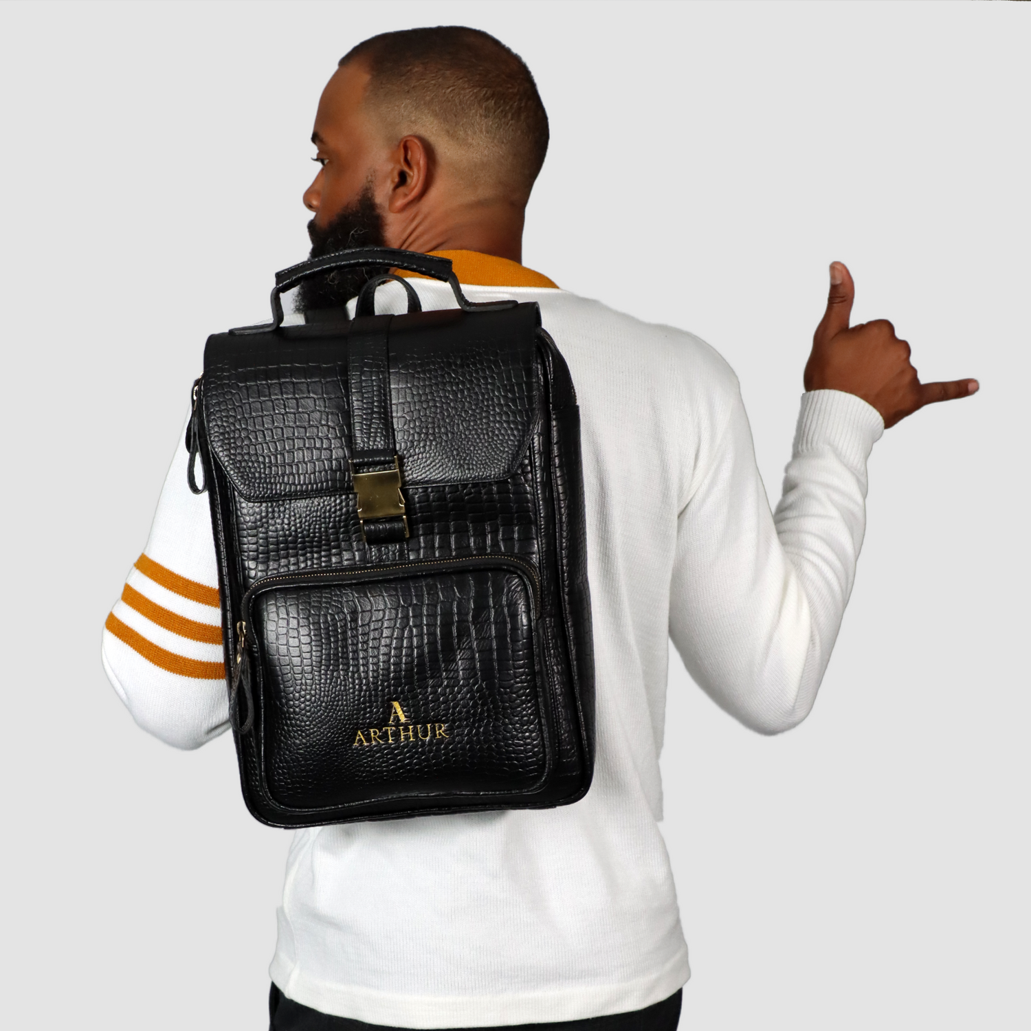 Crafted from crocodile-embossed leather and accented with old gold hardware, the Pendragon Backpack offers a distinguished look that speaks of quiet authority.